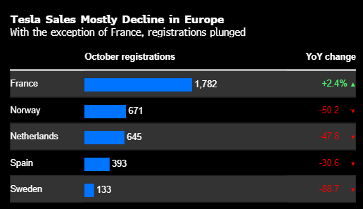特斯拉今年在欧洲多个市场销售严重下滑。